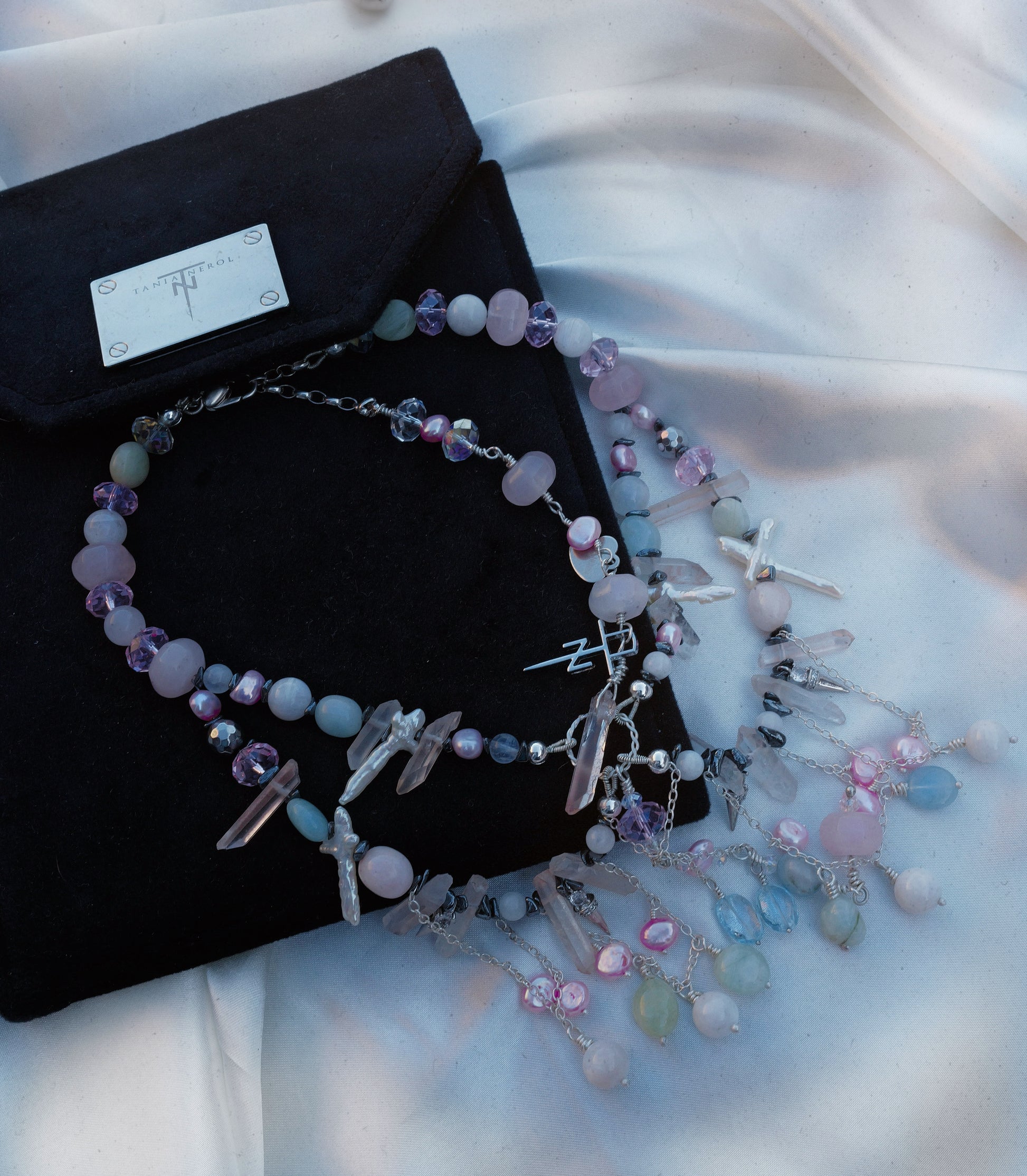 Two eye-catching dangling tanzanite stones, together with the other gemstones, bring graceful movement to the necklace with every step. The gentle blush of pink pearls softens the composition, creating a rare and balanced harmony.