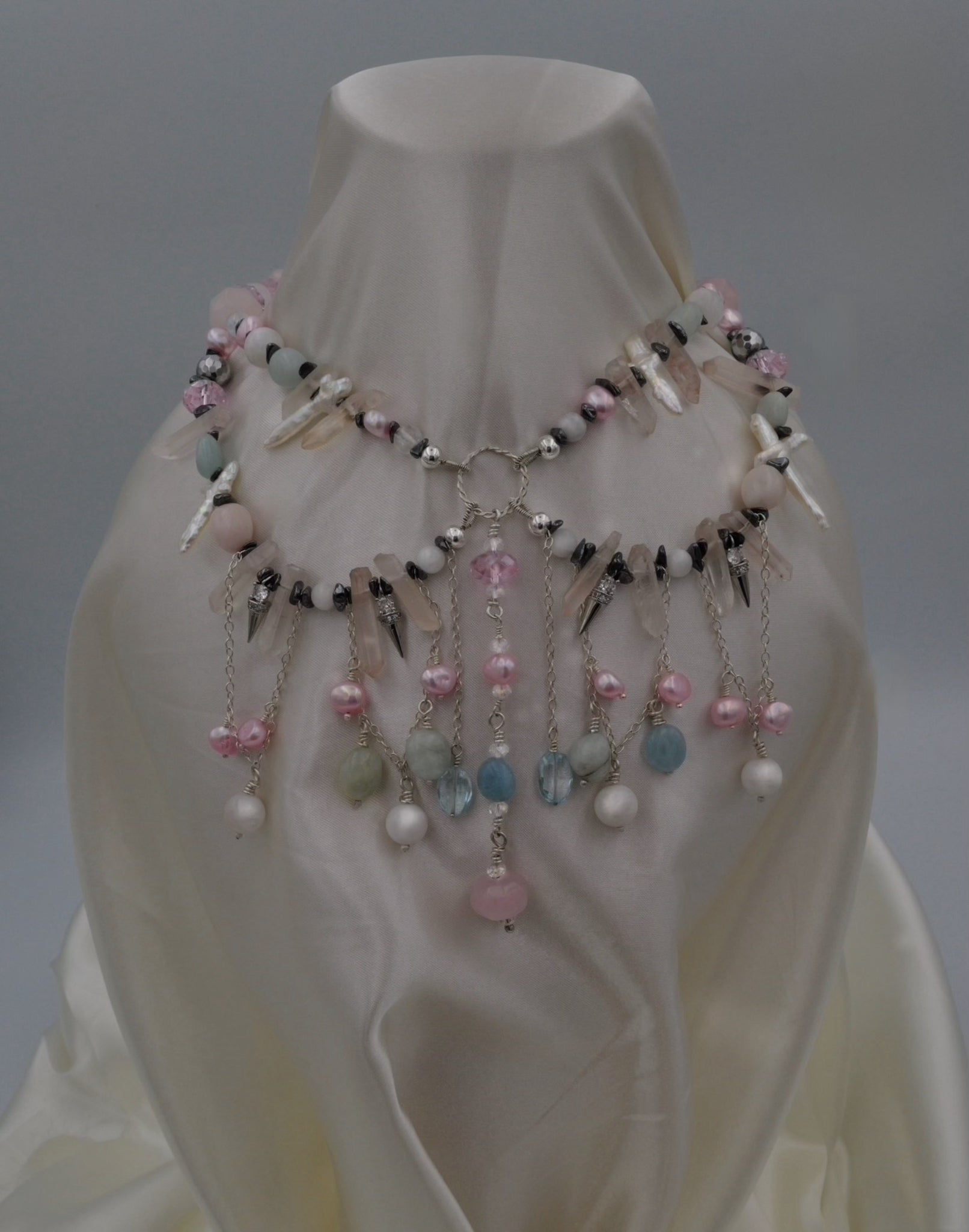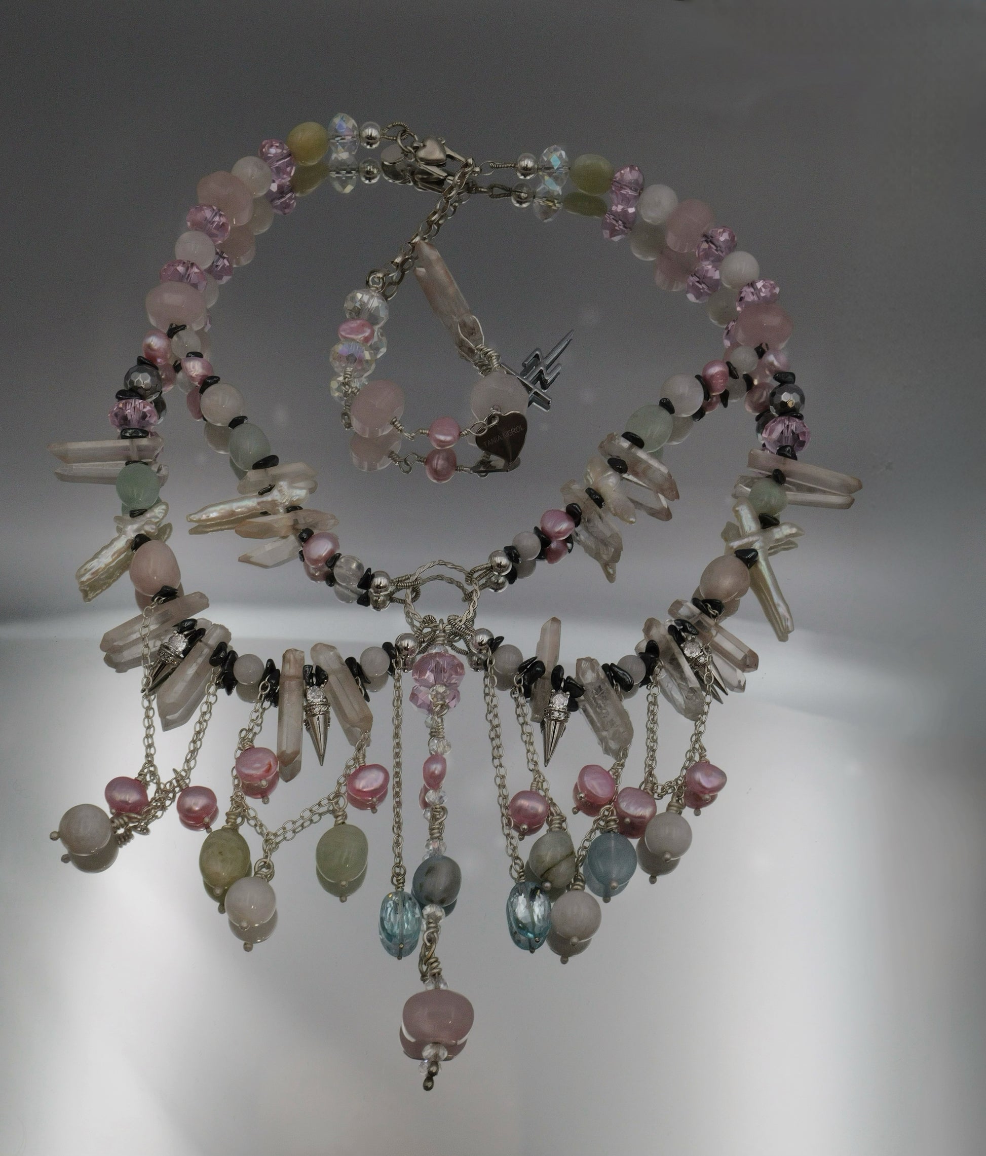 Handcrafted with passion, energy, and time, Innocent Drama carries the feeling of softness and elegance, but at the same time an edge of drama, like a theatrical dance on a stage. The shiny sparkles of the gems draw every eye your way, while hematite chips bring depth and intensity. A sterling silver cone charm with a zirconium-embedded gem adds brilliance, while the handcrafted circlesymbolizes the foreverness of the jewel. Handcrafted sterling silver details make it truly unique, a piece crafted entirely by hand.